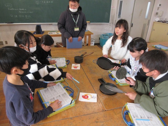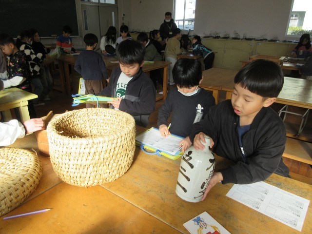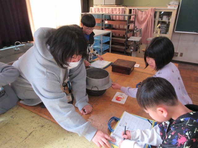 図工室では、3年生が移動博物館として昔の道具を実際に見たり、さわったりしながら昔の生活について学習していました。