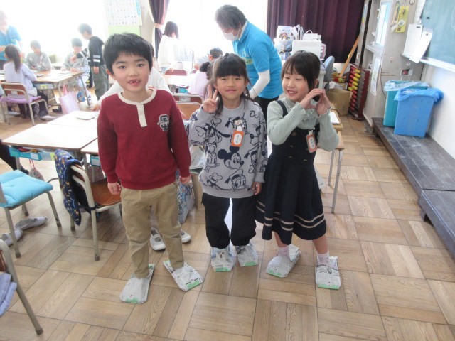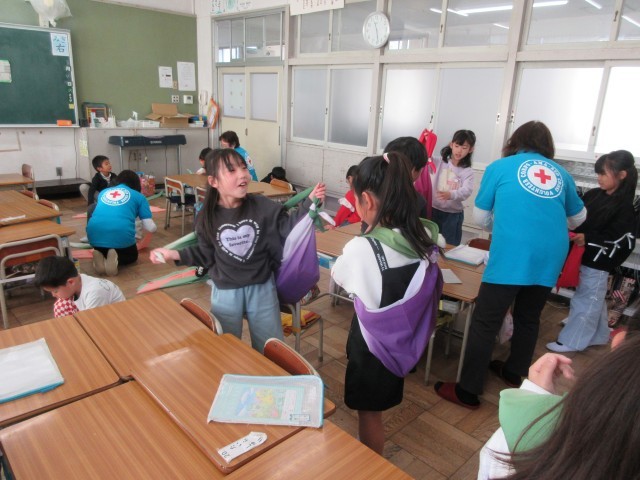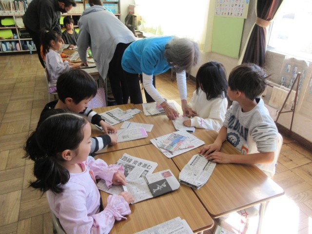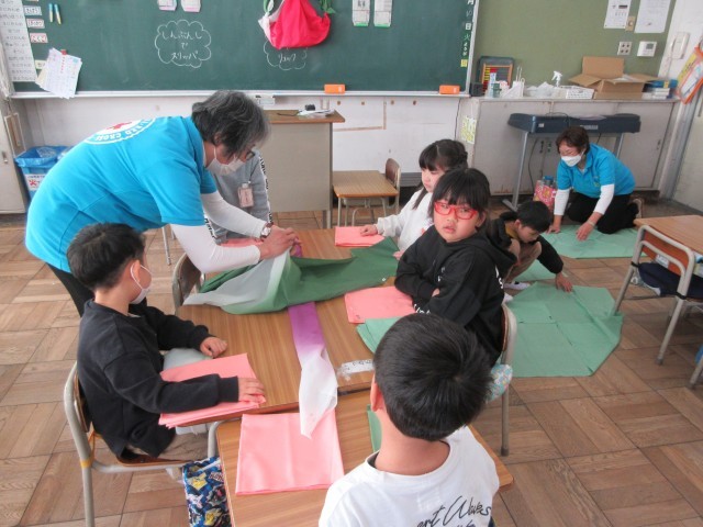 2・3時間目に日赤奉仕団の方にお越しいただき、新聞紙でつくるスリッパと、風呂敷でつくるリュックづくりを体験しました。