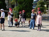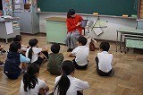 1年生は、防災用品5品目や非常持ち出し袋について教えていただきました。紙芝居「まっくらぐらぐら」を通して地震の怖さや、落ち着いて行動することの大切さを学びました。また、3リットルの水の入ったリュックサックを背負う体験をし、非常時の備えの重さと大切さを実感しました。