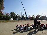 現在、グラウンドでは夜間照明の撤去工事が進められています。今日は、1年生が「はたらくくるま」の学習の一環として、作業の様子を見学しました。目の前でクレーン車が大きな柱をつり上げる様子に、子どもたちは目を輝かせて見入っていました。工事関係者の皆様、子どもたちの学びの機会をつくっていただき、ありがとうございます。