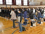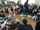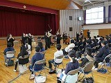 宝小学校と秋竹小学校の6年生が七宝北中学校での小中交流会に参加しました。昼食の時間には、中学生と一緒に、自分で作った弁当を食べながら楽しく会話を交わしました。先輩たちから中学校生活の様子を聞いたり、お互いの学校の話をしたりして、和やかな雰囲気の中で親睦を深めることができました。昼食後は体育館で芸術鑑賞会が行われ、オーケストラの生演奏に子どもたちは目を輝かせて聴き入っていました。中学校入学を控えた6年生にとって、期待と憧れがいっそうふくらむ一日となりました。