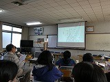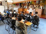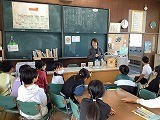 続いて、公民館に移動し、おまつの方の生涯や当時の時代背景について、保存会の皆さんが準備してくださったスライド資料をもとにお話を伺いました。子どもたちは熱心にメモを取りながら、地域の歴史への理解を深めていました。