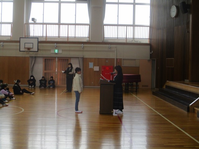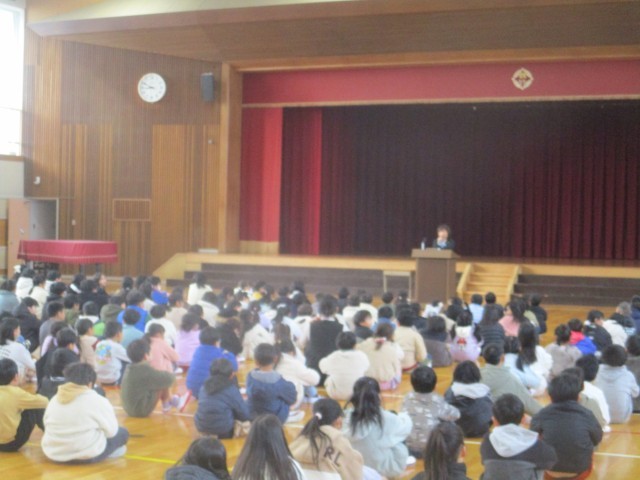 今日は、朝礼を行いました。最初に、読書感想文で優秀な成績を収めた児童の表彰を行いました。その後、校長先生のお話を聞きました。校長先生からは、新しい年を迎えたこの機会に、目標をもって努力したり、新たなことに挑戦したりしてほしいとお話がありました。また、一人一人よく考えて行動することを大切にしてほしいことと、とりわけ6年生について卒業までの間に在校生に何を伝え、何を残すことができるのかを考えてほしいと伝えられました。寒い中での朝礼でしたが、みんな真剣に話を聞いていました。