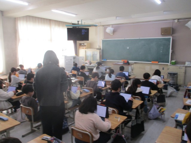 タブレット端末を使って、互いに作った文章を読み合っていました。