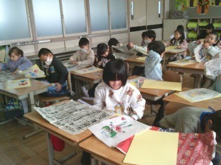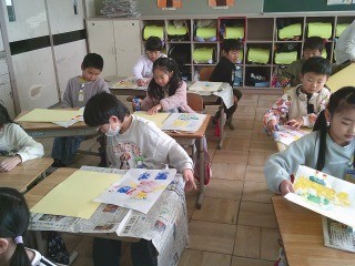 出来上がった版画を台紙に張り、刑事ができるように仕上げていました。版画と言っても、いろんな色を使った作品が多く、1年生らしい作品が完成しました。