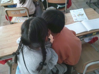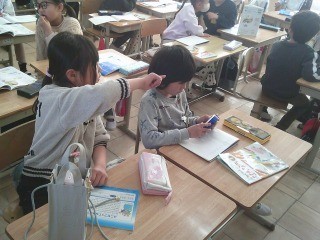 授業の始まりは、これまで学習したことの復習から。今日は、時計の問題です。先生が提示した時刻を読み取ります。隣の席の友達とペアになって、時刻を読み取ることができたら一方の児童が、もう一方の児童に周りに聞こえないようにこっそりと伝えます。皆、一生懸命に復習していました。