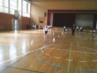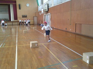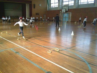 『小型ハードル走』の導入として、今日はミニカラーコーンや段ボールなどが、ジグザグに置かれたコースや、置かれている間隔が不揃いなコースを走りました。等間隔でまっすぐに並べられたコースと比べて走りにくいことを実感して、次回からは小型ハードル走に挑戦です。