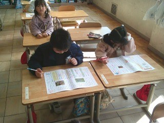 国語のテストを返してもらっていました。間違えたところを、もう一度考えて解き直していました。直したテストを先生に確認してもらって、テスト直しは終了です。よく頑張りましたね。