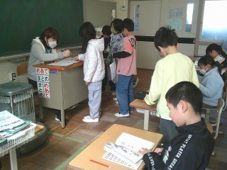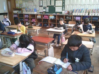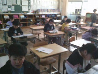 テストが返され、直しをして先生の確認です。終わった子は漢字の学習を進めていました。