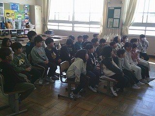 2年2組 読み聞かせ 公開日 2026/03/12 更新日 2026/03/12 学校生活のようす キツネが主役の絵本でした。山に向かって大きな声を出すと返ってくるやまびこの不思議について、興味のわく絵本でした。
