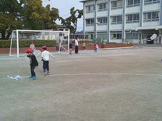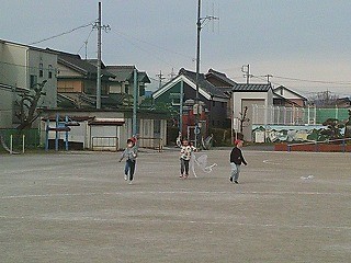 生活科の時間に作った凧を上げていました。高く揚げようと、一生懸命にたこ糸をもって走る姿がかわいかったです。