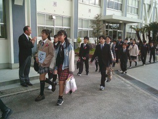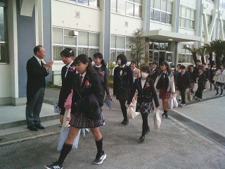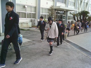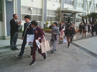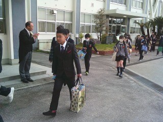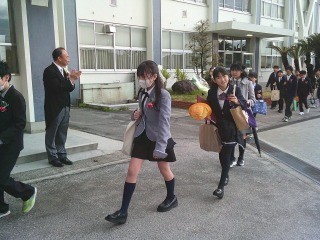 学活が終わり、送り出しを職員・保護者で花道を作り、行いました。卒業証書を片手に、大切な仲間や職員との別れを十分に味わいながら門から去っていく卒業生の背中にたくましさと寂しさを感じました。中学校でも活躍するのを職員一同願っています。