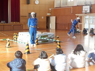 3年生が、愛知県警察本部第1機動捜査隊BーForceの皆さんと津島警察の方を講師にお迎えして、交通安全教室を行いました。事故に遭う と衝突の衝撃でヘルメットがとれてしまい頭を守ることができないこと、正しいヘルメットの被り方の3つのポイントを実技を通して教えていただきました。また、「止まれ」の標識がある時の安全な止まり方を代表児童が自転車に乗って体験させていただきました。今日学んだことを良い習慣として身につけることができるように心がけ、命を大切にしてほしいと感じました。