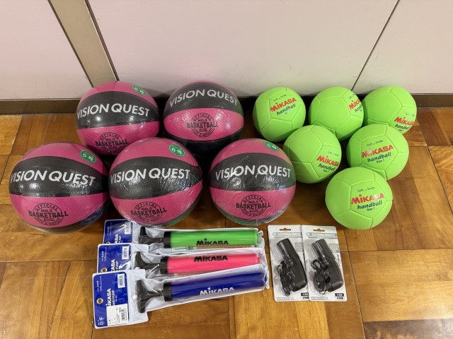 昨年12月に、本校は「体力向上部門・優秀賞」を受賞しました。その副賞としていただいたギフトカードを活用し、屋外用バスケットボールや体育用ハンドボール、手押し式の空気入れ、電子ホイッスルなど、子どもたちが休み時間や体育の授業、レクリエーションなどで使用する用具を購入しました。