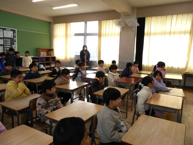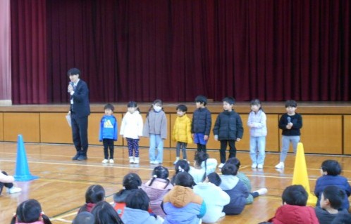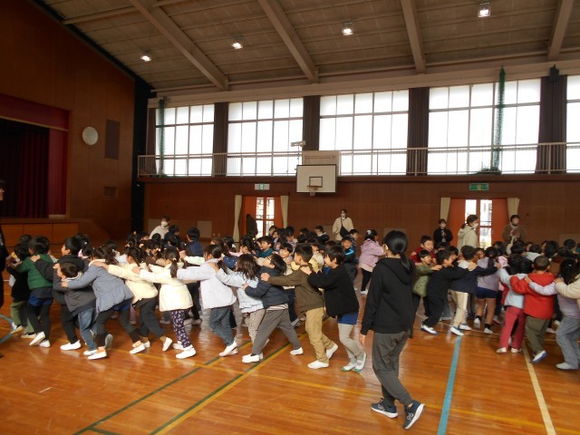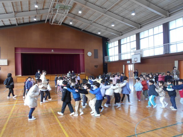 今日の2時間目に、1年生が美和こども園の年長児と交流会を行いました。教室での朝の会や体育館でゲームなどをしました。年長児にやさしく話しかける1年生の様子は、もうすっかりお兄さんお姉さんでした。