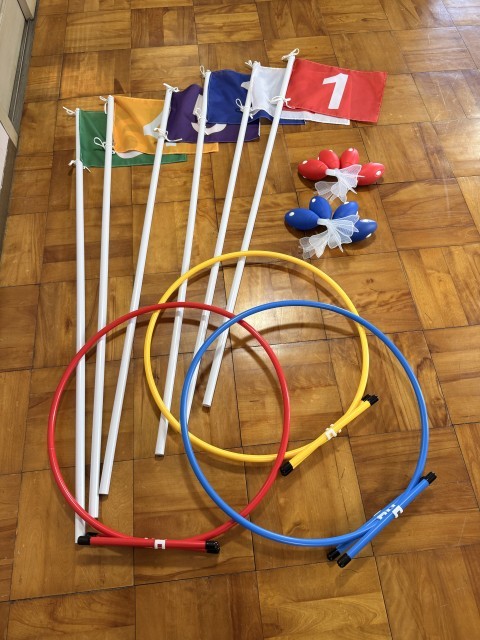 今回購入したのは、運動会で使用する着順旗とポール、水泳で使うリング、体育で使用するロケットボール、一輪車を置くための一輪車ラック、運動会でトラック脇に設置するミニコーン、保健室で使用する布団干し、運動会やレクリエーションなど屋外で使うマイクです。