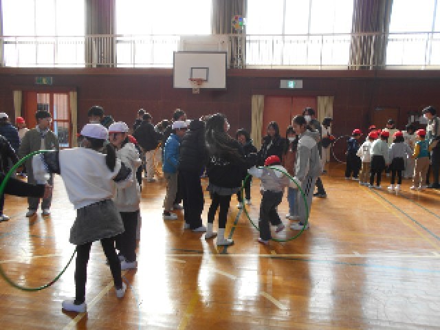 グループで手をつないだままフラフープくぐりをしました。隣の友達と協力し、声をかけ合いながら進めました。心を一つにでき、楽しい会になりました。