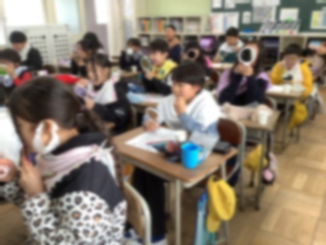 4年生では、学校歯科医の方と歯科衛生士の方をお招きして、バトンタッチ運動を行いました。自分の歯茎が健康かどうかを確認し、磨き残しがないか染め出しを行いました。そして、歯と歯茎の境目の歯垢が取れるような歯の磨き方を練習しました。