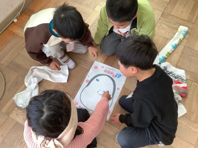 生活科で「福笑い」をしました。できあがった顔を見て、みんなで大笑いをしました。たくさん笑って、元気になりました。