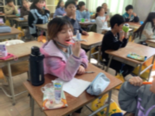 給食の後、歯磨きを頑張っています。歯磨き粉を使って歯を磨いている人もいました。
