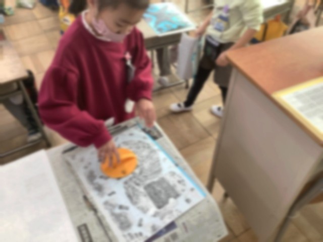 2年生は、版画の刷りを行いました。オリジナルの模様が写った作品を見て、みんなで感動していました。