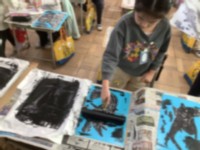 2年生は、版画の刷りを行いました。オリジナルの模様が写った作品を見て、みんなで感...