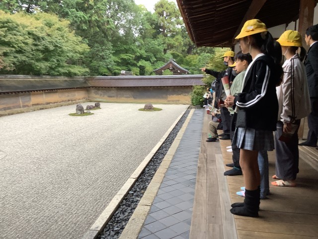 6年生 修学旅行2日目 タクシー分散 公開日 2025/10/31 更新日 2025/10/31 学校生活のようす 雨の石庭を見学しています。運転手さんにガイドしていただきながら巡っています。「視点を変えないと全体がわからない」ことを、わかりやすく解説していただきました。