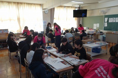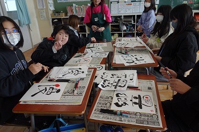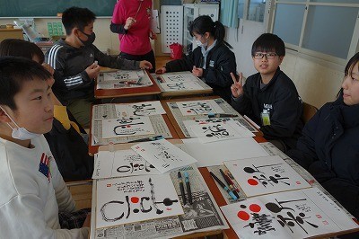 6年生の出前授業の様子です。己書(おのれしょ)の講師さんを5名招き、自分の思いを込めた漢字一字を色紙に書きました。作品の出来栄えにみんなにっこり。完成した作品は卒業式の会場に掲示しますので是非ご覧ください。