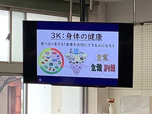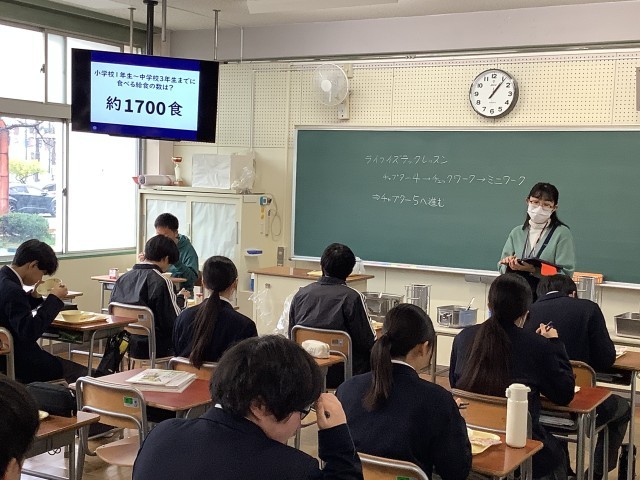「身体の健康」「環境への配慮」「感謝の気持ち」について考えることをテーマに、栄養教諭による給食指導を3年生の生徒を対象に行いました。